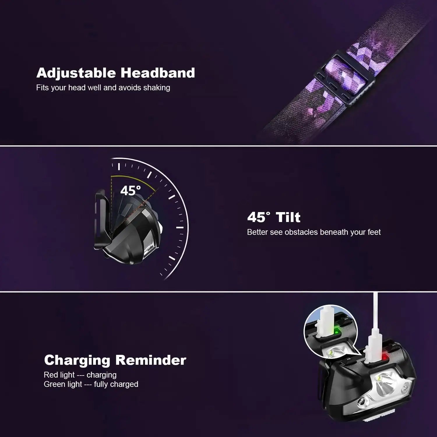 2 Pack Rechargeable Headlamp Outdoor Waterproof Motion Sensor LED
